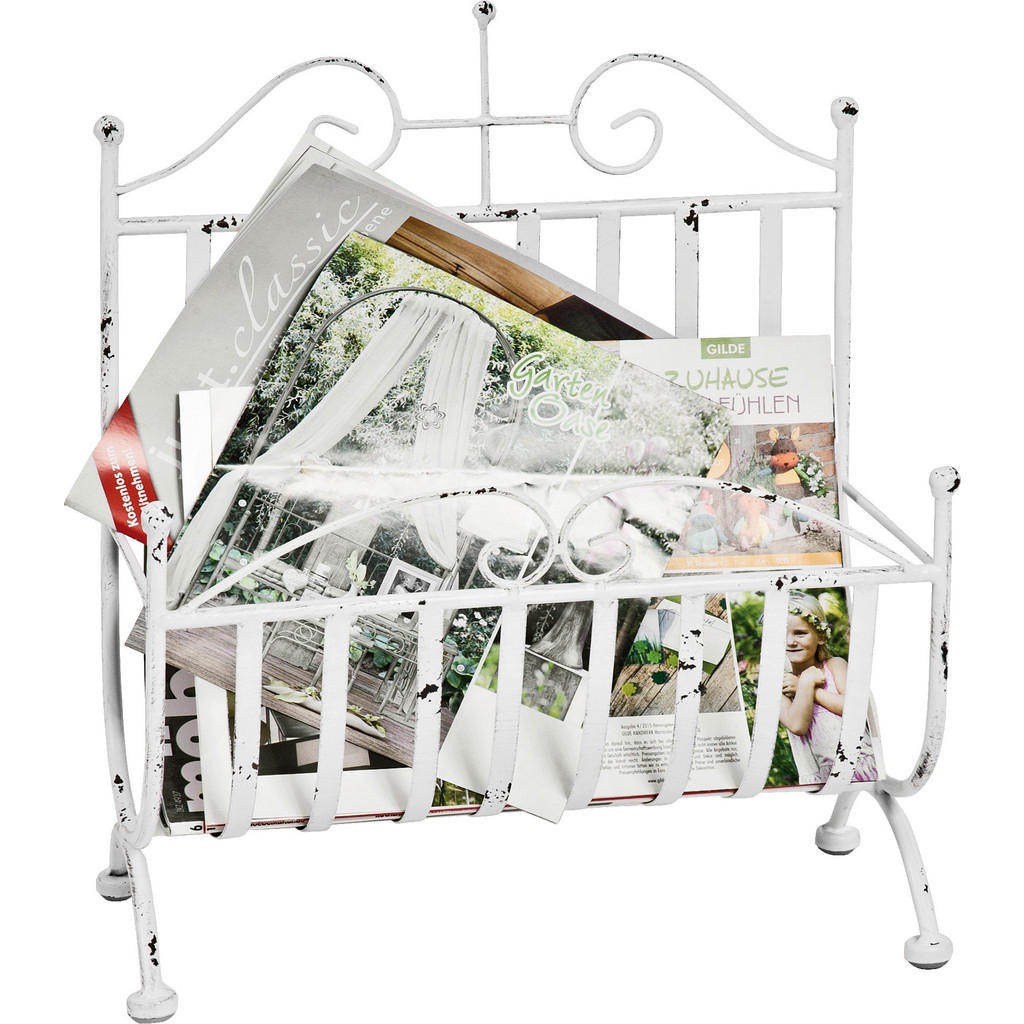 Tento stojan na noviny Vás okouzlí svou jednoduchou elegancí. Stylový stojan o rozměrech cca 37 x 44 x 18 cm (Š x V x H) je vyroben z kvalitní oceli v bílé barvě a jeho tvar dává vzpomenout na časy dávno minulé. Mějte své noviny a časopisy vždy po ruce díky tomuto praktickému stojanu! – **TYP: 26395 – **OCELOVÁ TRUBKA – **LAK ANTICKÁ BÍLÁ