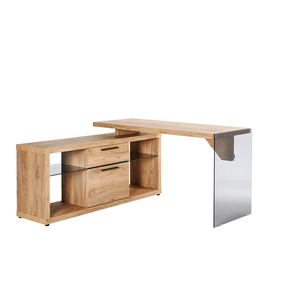 ROHOVÝ PSACÍ STŮL, barvy dubu, 141,8/140/74 cm – ONLINE AT,75L50,KP+FR: – KERNEICHE,NB, ABSETZUNG: – GRAUGLAS,,GRIFF: SCHWARZ